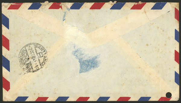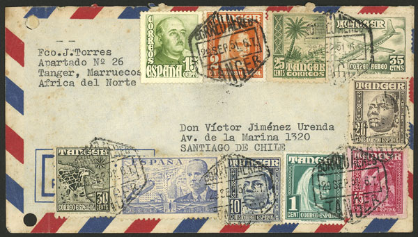 Airmail cover sent from Tanges to Santiago de Chile on 29/SE/1951 with very nice multicolor postage, the envelope with some some defects (filing punch holes at left, and part of back flap is missing), unusual destination! (Image) (Image-02)