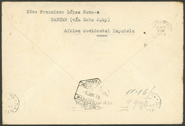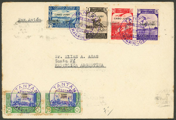 Airmail cover franked with stamps of CABO JUBY, sent from TAITÁN to Argentina on 2/JUN/1949, arrival backstamp of 12/JUN, very rare destination!