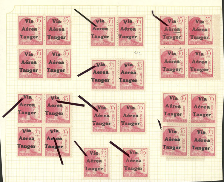 VARIETIES: Yvert 23, 4 blocks of 4 + 3 pairs and 2 singles, all with OVERPRINT VARIETIES (without accent, fallen letters, etc.), very fine quality!
