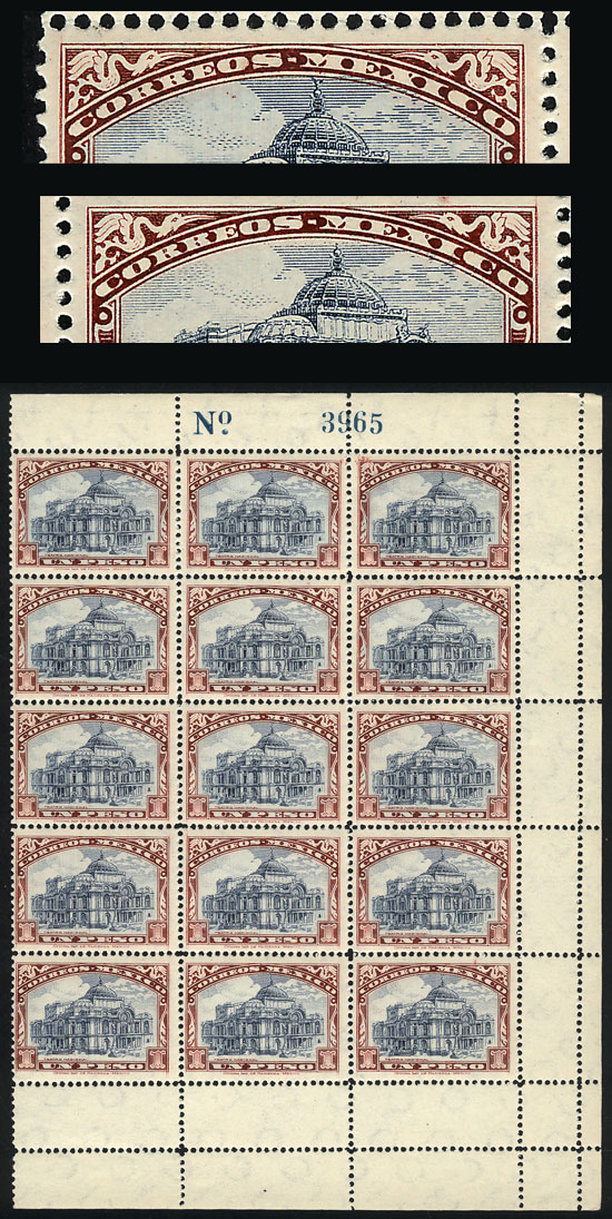 649a, 1923 1P. Naciones Theater, beautiful block of 15 (right part of the sheet), 12 stamps are type I (eagle above the dome) and 3 are type II (no eagle), MNH, excellent quality! (Image)