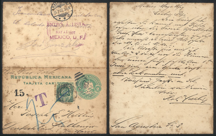 Lettercard sent to Germany on 11/MAY/1907, with manuscript inscription on back: "It was found and delivered in this state" and the signature of the postman, with lilac mark: "Entró a lista - MAY 11 1907, Mexico D.F.", postage due mark,