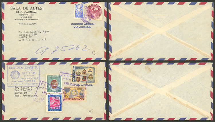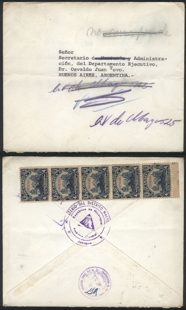 cover franked on reverse with strip of 5 of 4c. dark blue (total 20c.), sent from Managua to Argentina on 16/DE/1935?, VF quality, rare! (Image)