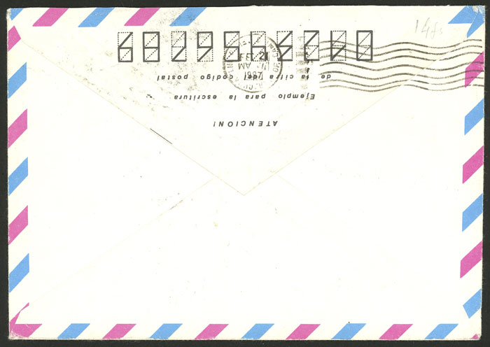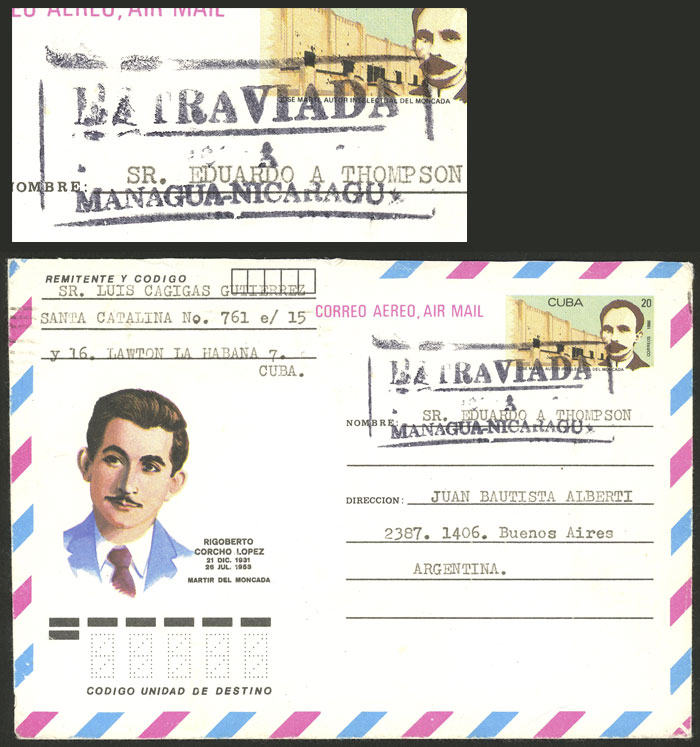 RARE POSTAL MARKING: Stationery envelope sent from Cuba to Argentina in 1987, sent by mistakge to Nicaragua where it received (over the postage) the mark "EXTRAVIADA - MANDAGUA - NICARAGUA", VF quality! (Image) (Image-02)
