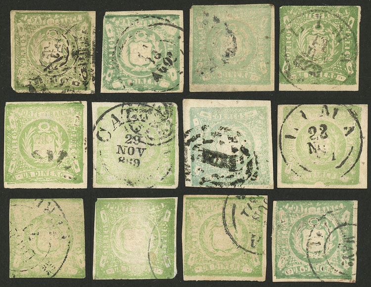 13, 1868 1d. green, 12 used examples, varied cancels and shades (including a spectacular OLIVE GREEN), very fine general quality, low start! (Image)