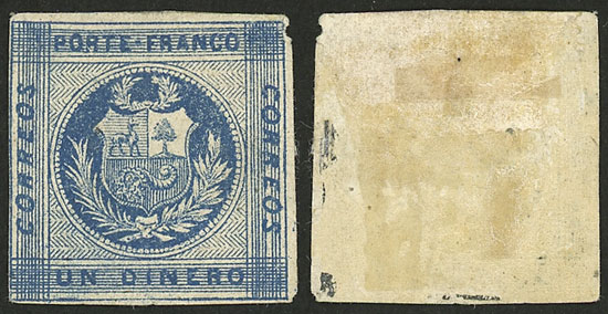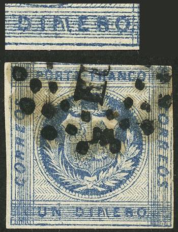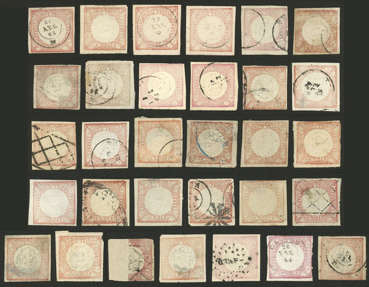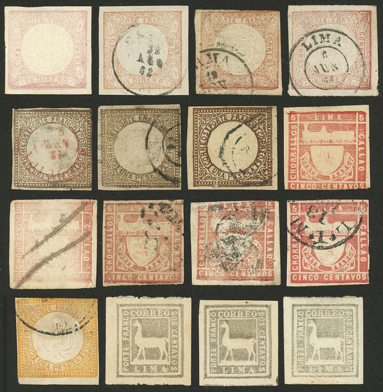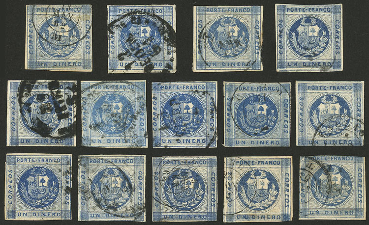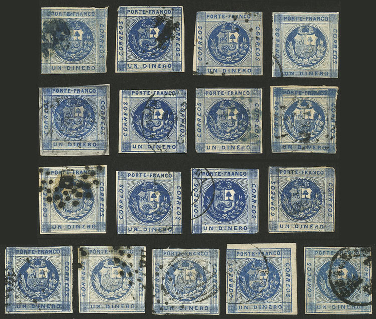 other values, Un Dinero blue, 14 used examples, several different printings, also wide range of shades and cancels, a quick glance reveals VARIETIES: "CORRECS", "accent over the R of FRANCO", "PORTC" etc, in general of fine to very fine quality, very