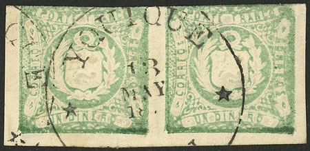 1D. green, pair with a spectacular large datestamp of YQUIQUE perfectly applied, the left stamp has a tiny thin on back, excellent front, rare (Image)