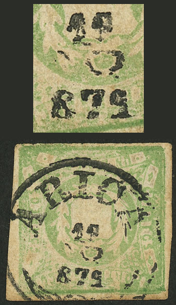 1D. green, with datestamp of ARICA dated "11/?/1875" (or "1879"), with the last number in the year formed with an inverted "5", VF! (Image)
