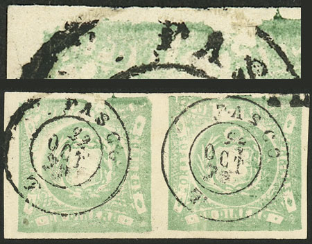 1868 1D. green, beautiful pair with double datestamp of PASCO 22/OC/1872, superb! (Image)