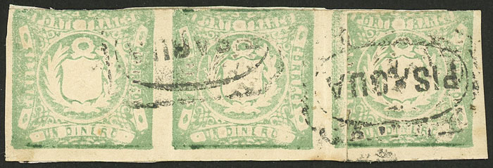 1868 1D. green, strip of 3 with the right stamp printed over joined papers, with cancels of PISAGUA, very handsome! (Image)