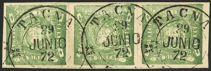 1868 1D. dark green, strip of 3 (rejoined) with 3 cancels of TACNA 29/JUN/1872, excellent! (Image)