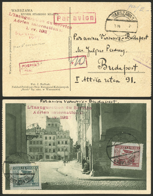 1/AP/1927 Warszawa - Budapest, first international airmail, postcard franked with 40gr., with several special handstamps, etc., VF quality! (Image)