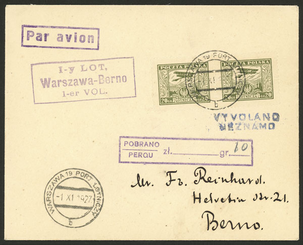 3/NO/1927 Warszawa - Brno, first flight, a total of 120 pieces were carried, excellent quality! (Image) (Image-02)
