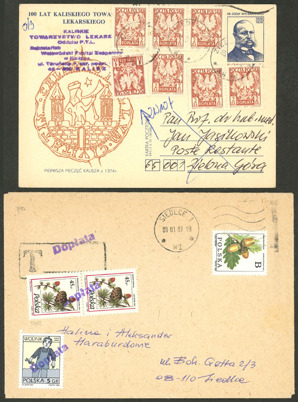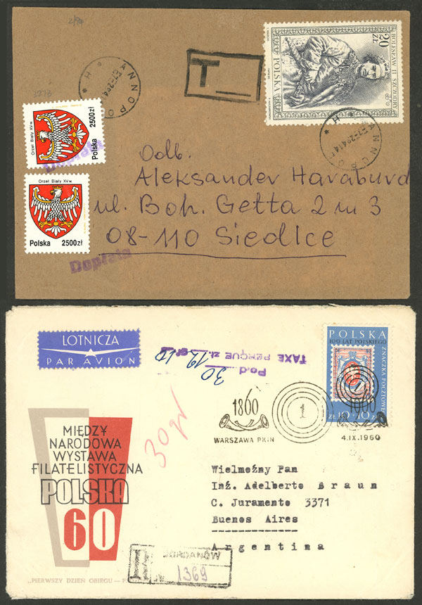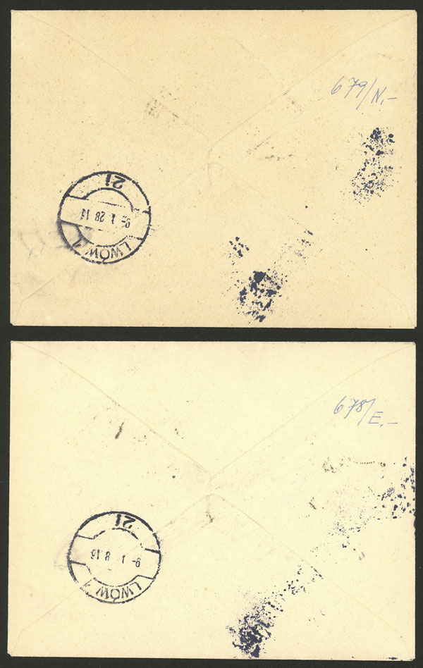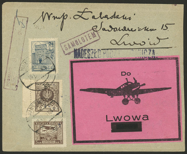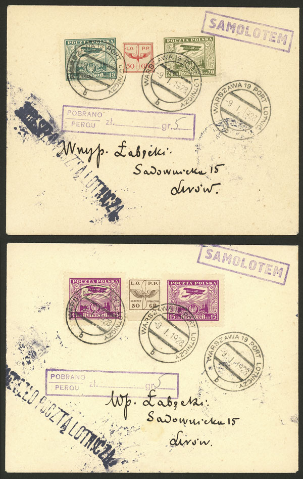 9/JA/1928 Warszawa - Lwow, couple of airmail covers franked with 30gr. and with special label of 50gr., both with arrival mark on back, excellent quality!
