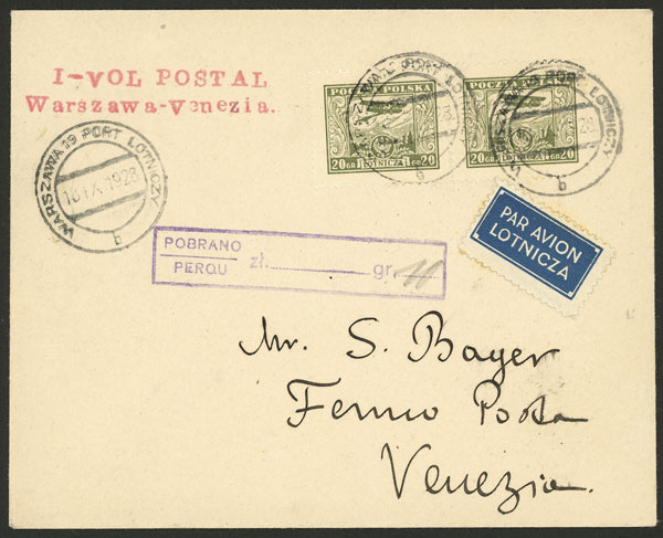 18/SE/1927 Warszawa - Venezia, first airmail, with arrival backstamp (19/SE), only 55 letters were flown, excellent quality! (Image) (Image-02)