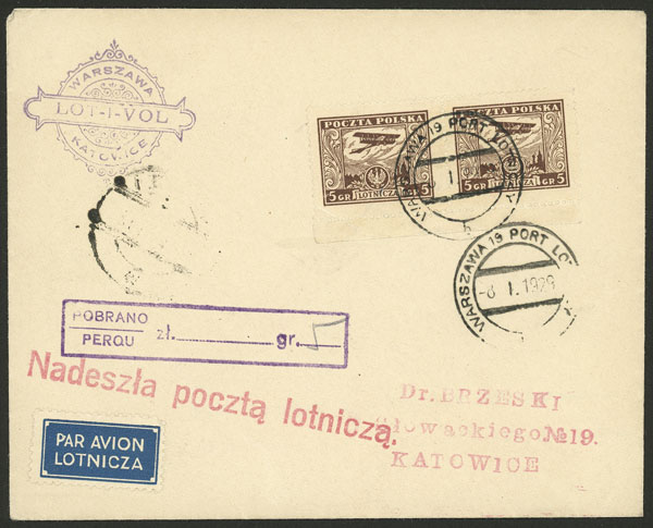 8/JA/1929 Warszawa - Katowice, first flight, with arrival backstamp, excellent quality! (Image) (Image-02)