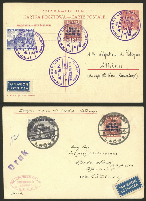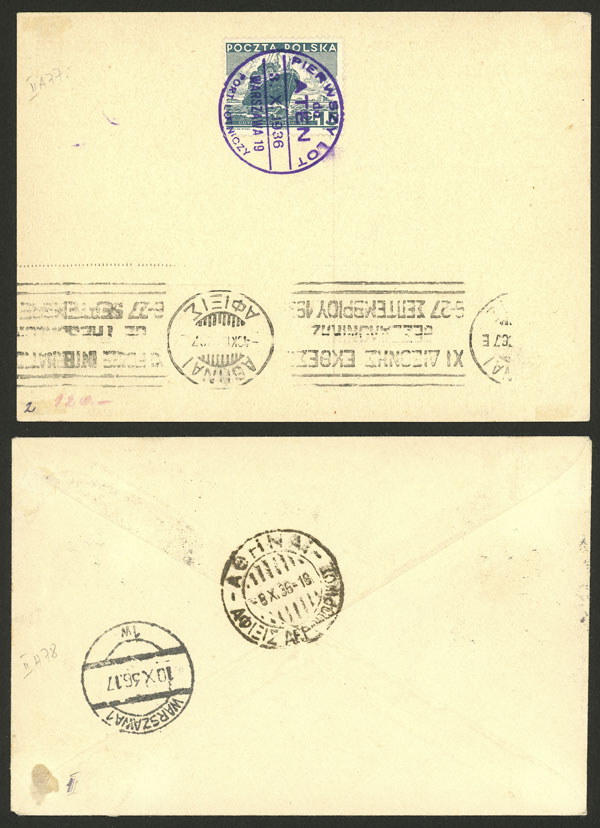 3/OC/1936 Warszawa - Athens and Lwów - Athens (Greece), card and cover with varied marks and arrival backstamp, excellent quality! (Image) (Image-02)