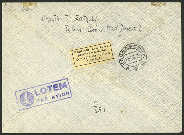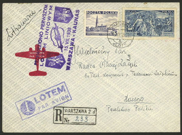 15/JUL/1938 Warszawa - Kaunas (Lithuania), cover with special handstamps, arrival backstamp, excellent quality! (Image) (Image-02)
