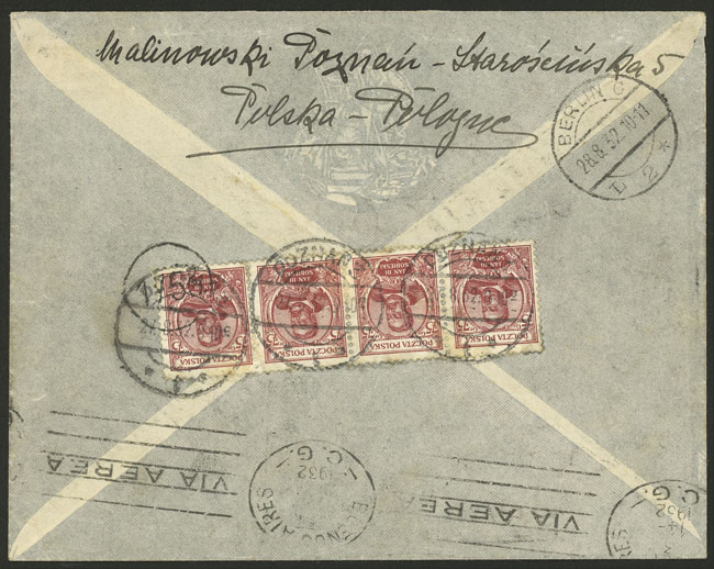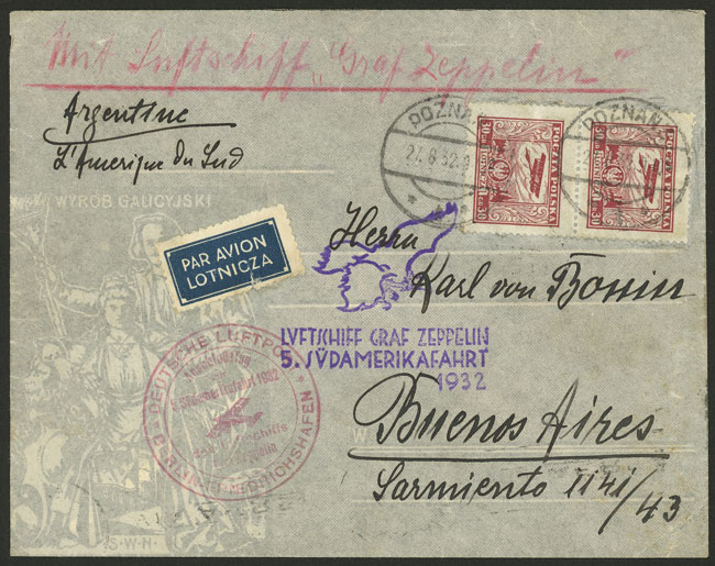 27/AU/1932 Poznan - Argentina, 5th flight of ZEPPELIN to South America with transit mark of Belin and arrival of Buenos Aires on 3/SE, excellent quality, rare!