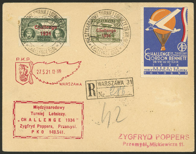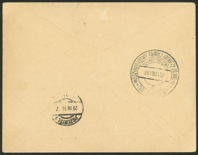 28/AU/1934 Warszawa - Przemysl, cover franked with Sc.C11/12 + cinderella "Challenge Gordon Bennett", arrival backstamp, excellent quality!