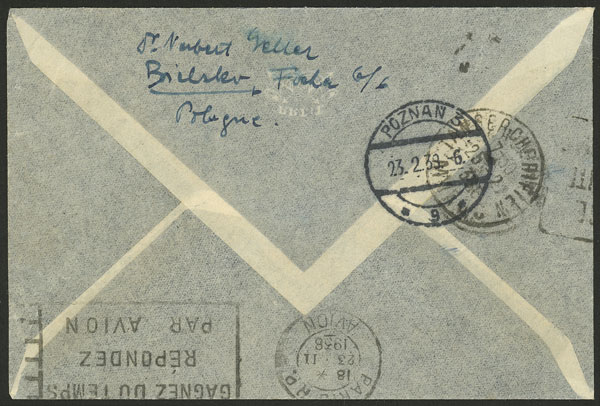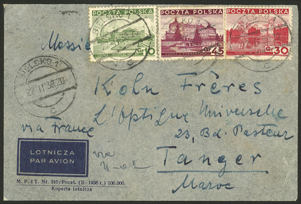 22/FE/1938 Bielsko to Morocco, airmail cover sent by Air France franked with 85gr., on back transit marks of Poznan, Paris, and arrival, VF quality!