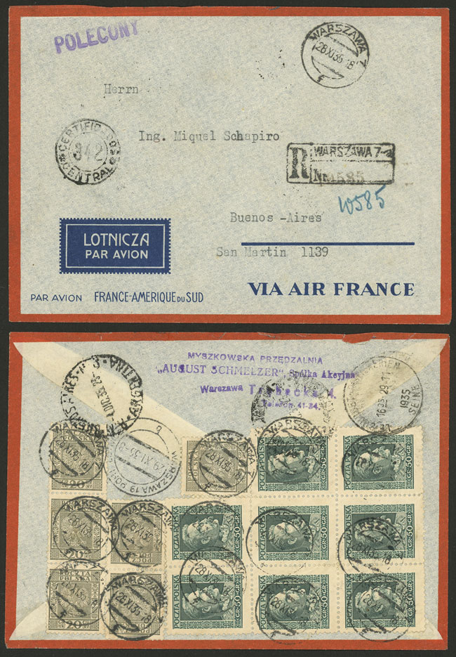 28/NO/1935 Warszawa - Argentina, registered airmail cover sent by Air France with attractive postage of 5.20Zl., on back transit mark of Le Bourget 29/NO and Buenos Aires arrival for 4/DE, excellent quality! (Image)