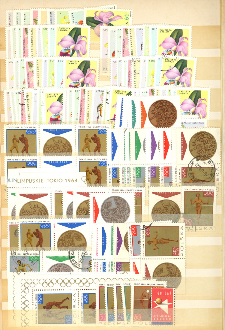 Immense stock of very thematic stamps in a very large stockbook, I estimate thousands of singles, in pairs, blocks of 4 and larger, with many complete sets, almost all MNH or used cancelled to order, HUGE CATALOG VALUE, very low start!
