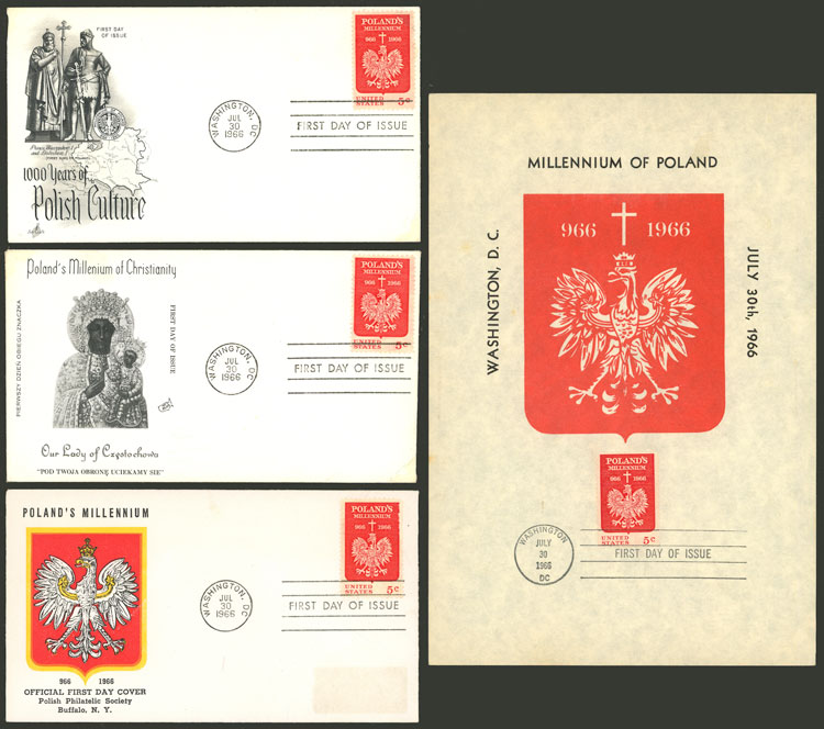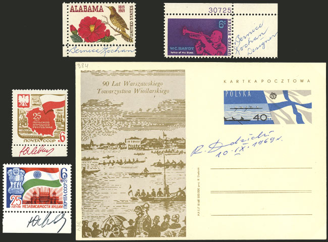 Stamps (2 of USA and 2 of Russia) + 1 postal stationery, all with signature of their Polish designer, excellent quality! (Image)
