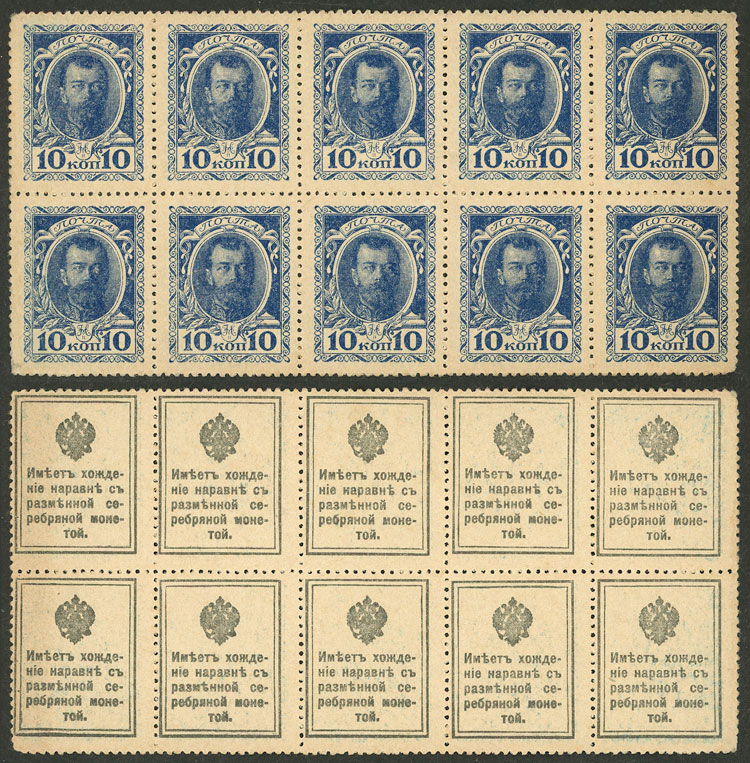 1915 10k. blue, MNH block of 10 (issued without gum), excellent quality! (Image)