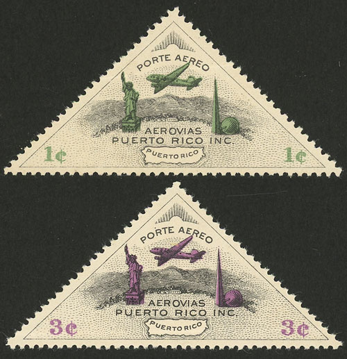 Aerovías de Puerto Rico Inc, triangular cinderellas of 1c. and 3c., both with light crease, very good front, interesting! (Image)