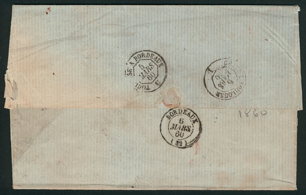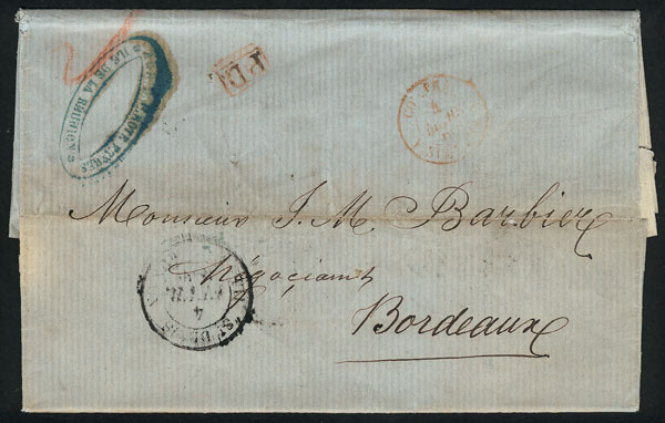 Entire letter dated Réunion 6/FE/1860 and sent to Bordeaux, with interesting postal markings on front and back, VF quality! (Image) (Image-02)