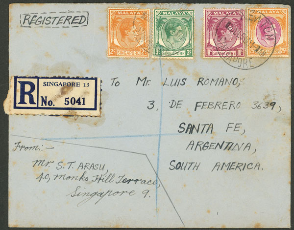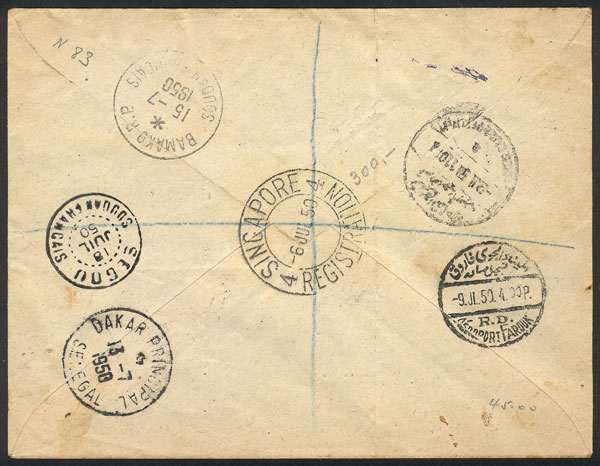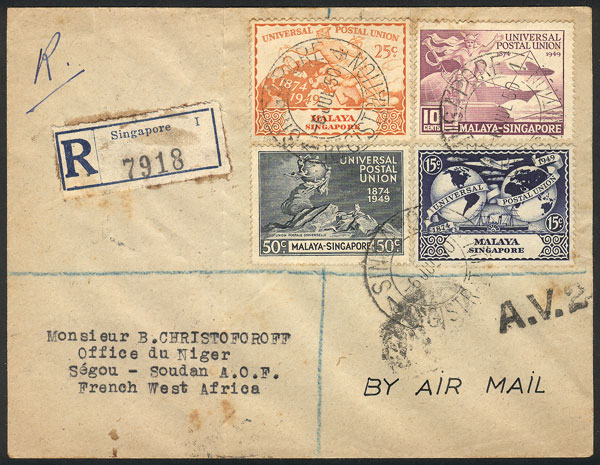 Registered cover sent to Sudan on 6/JUL/1950, franked with the 4 values of the UPU anniversary issue, with many cancels on back, VF! (Image) (Image-02)