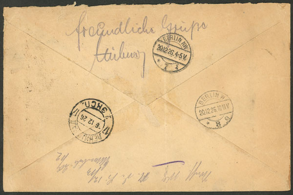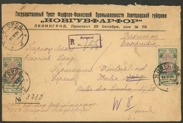 15/DE/1925 Novgorod to Germany, registered cover franked with 28k. (Yvert 358 x2, Intl. Congress of Esperanto), several transit and arrival marks, very attractive! (Image) (Image-02)