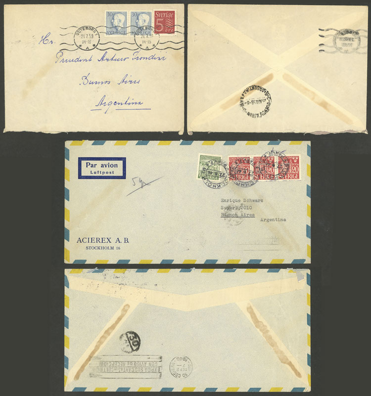Couple of airmail covers sent to Argentina on 8/JUN and 26/JUL/1945 with nice frankings and censored. Also a cover sent to President Frondizi in Argentina in 1959, VF! IMPORTANT: Please view ALL the photos of the lot, because all the