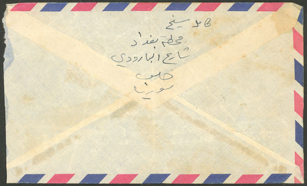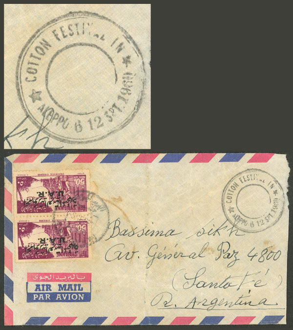 Airmail cover sent to Argentina with attractive postage and special mark "COTTON FESTIVAL IN ALEPPO", with small defects but attractive! (Image) (Image-02)