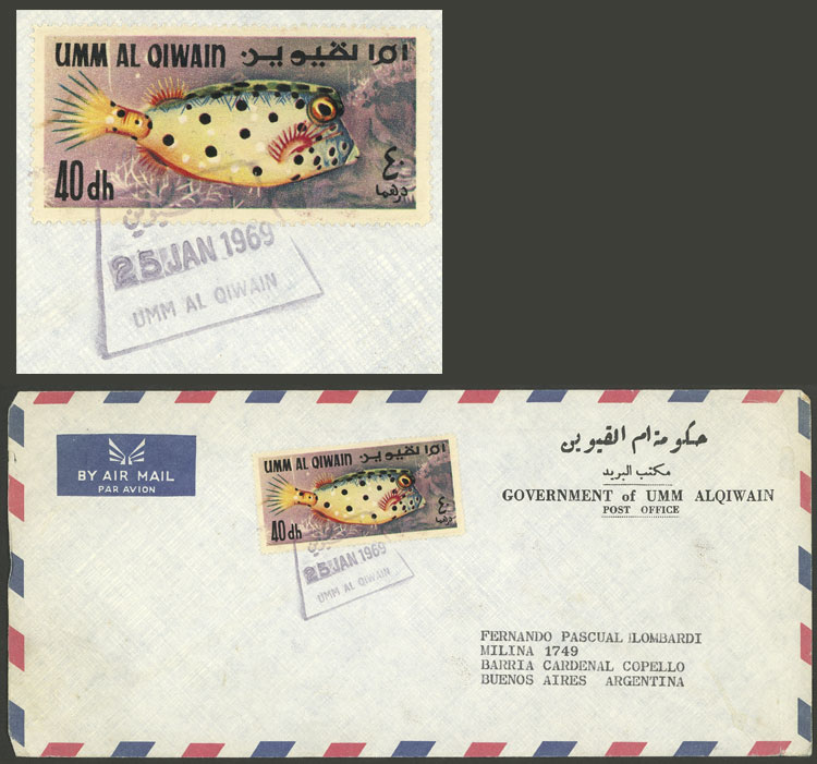 25/JA/1969 Umm Al Qiwain - Argentina, airmail cover franked with 40dh., rare destination, VF quality! (Image)