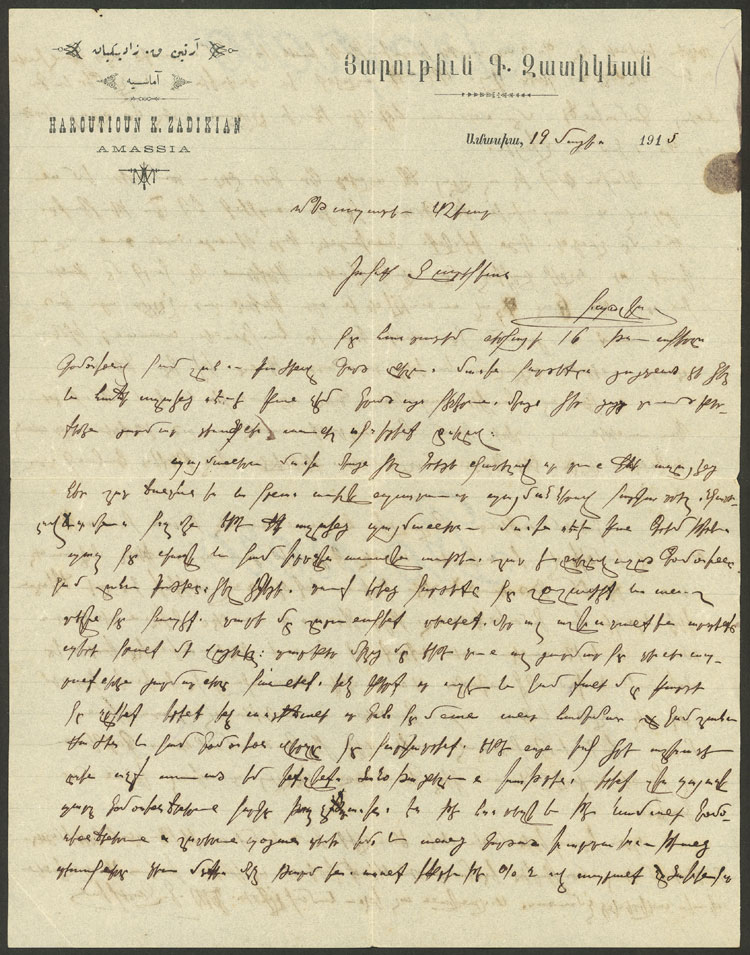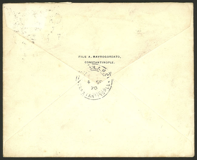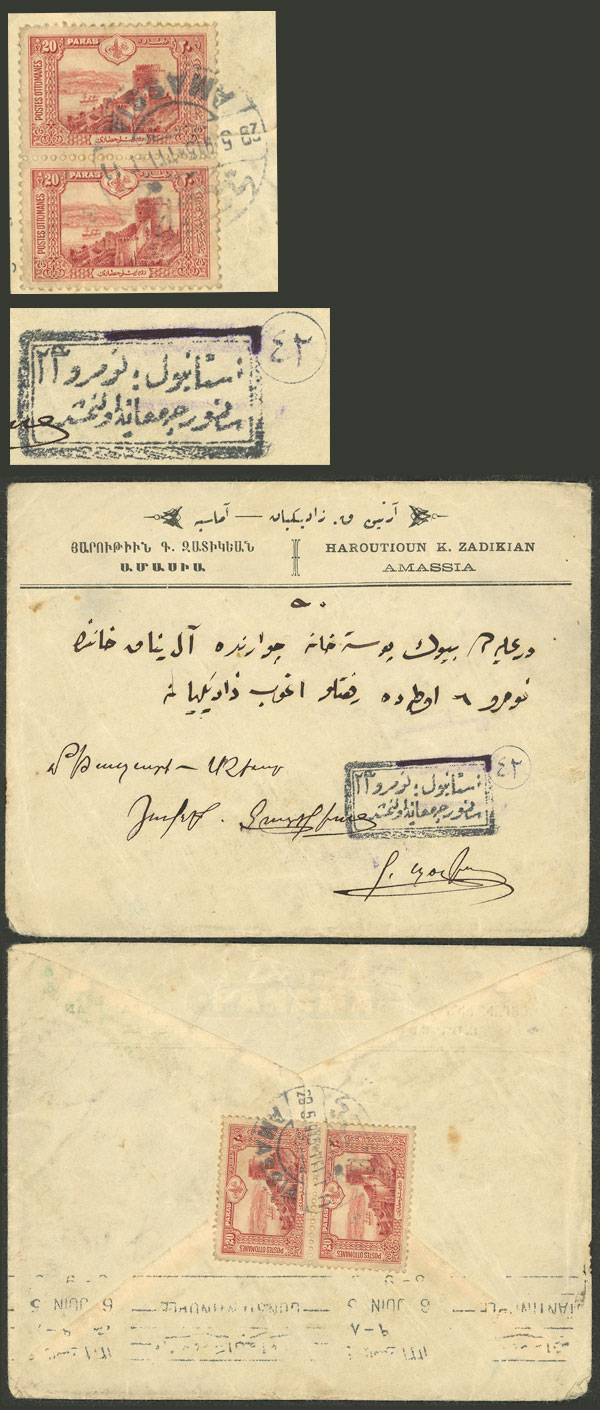 Cover (including a long letter written in Armenian) posted in AMASSIA on 29/MAY/1915 by a person of Armenian descent (Haroutioun K. Zadikian), with attractive franking on back. Apparently it was dispatched unsealed, very interesting! (Image) (Image-02)