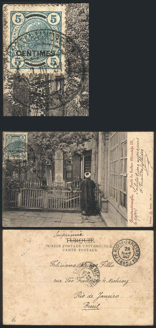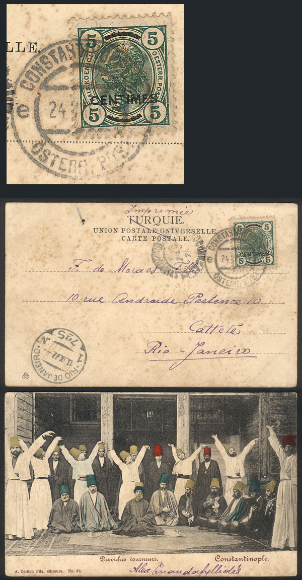 sent from Constantinople to Brazil on 1/MAR/1907, franked with stamp of the Austrian offices in CRETE Sc.8a (5c. on 5h blue-green WITHOUT varnish bars), fine quality, very nice and rare! (Image)