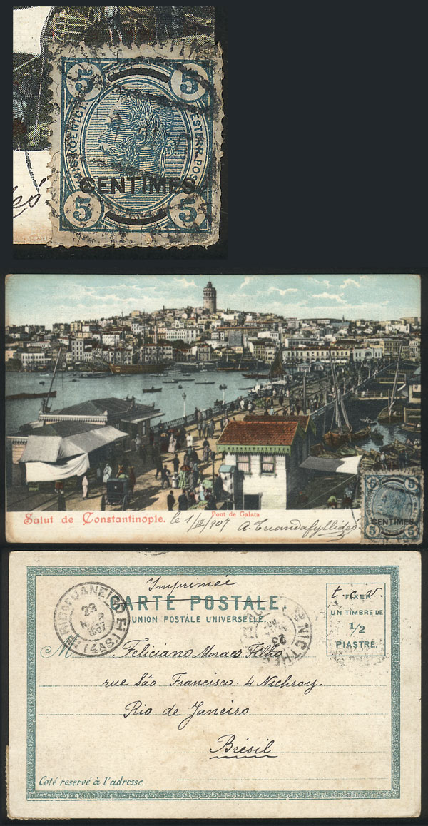 sent from Constantinople to Brazil on 1/MAR/1907, franked with stamp of the Austrian offices in CRETE Sc.8a (5c. on 5h blue-green WITHOUT varnish bars), with very light defects, very nice and rare! (Image)