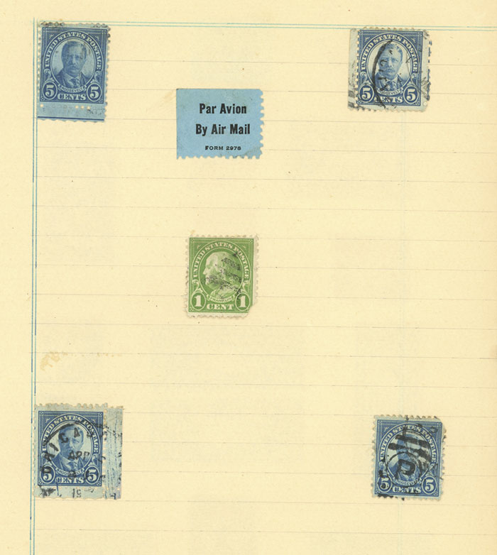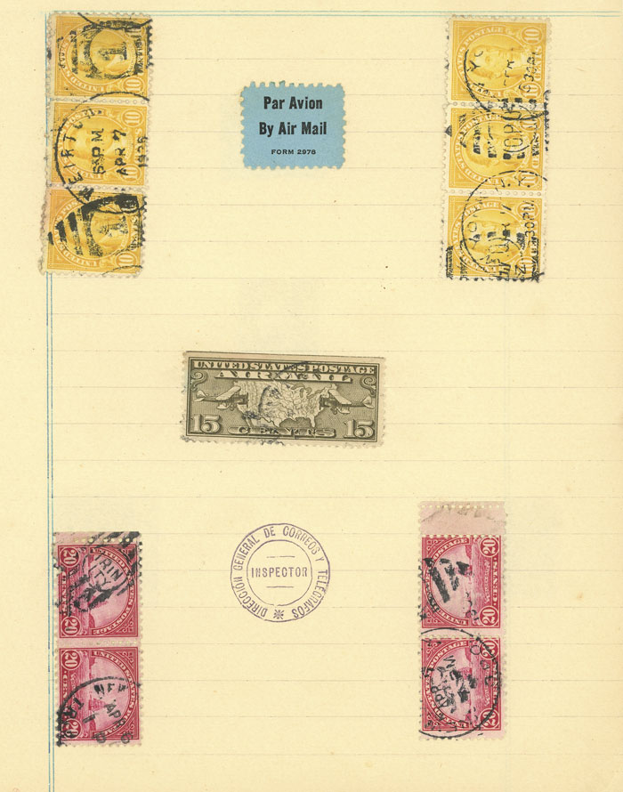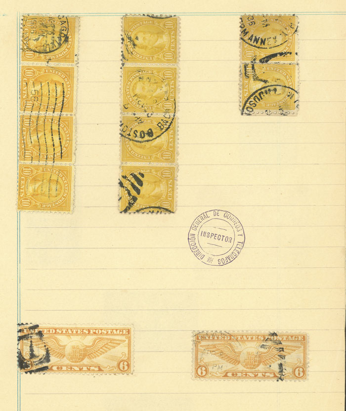 Notebook with many postage stamps taken from foreign CRASH COVERS, collected in circa 1935/6 by an employee of Dirección General de Correos in Buenos Aires. Most stamps from USA, there are some examples of Japan and other countries,