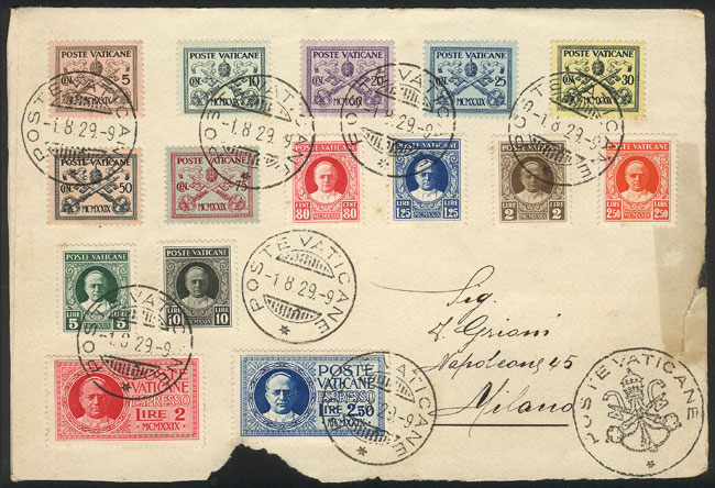 cover franked with the complete set Sc./Sassone 1/13 + E1/2 with postmark of 1/AU/1929 (first day of issue), with some minor defects (the stamps of excellent quality!), good opportunity! (Image)