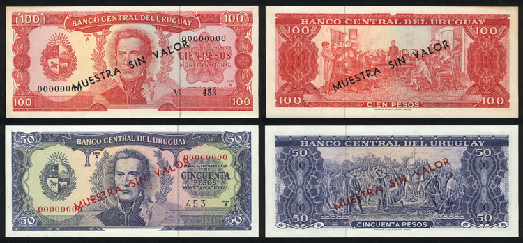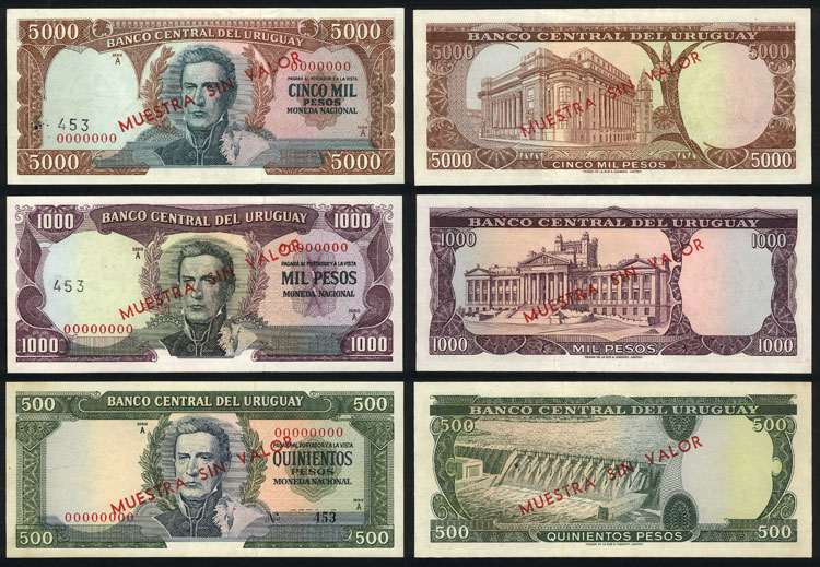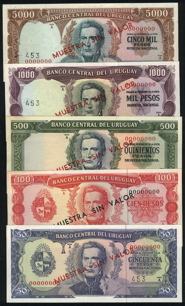 1967 Issue, banknotes of 50, 100, 500, 1000 and 5000 Pesos overprinted "MUESTRA SIN VALOR", serial "00000000" with another printed number "453" (specimen number), excellent quality! (Image) (Image-02)
