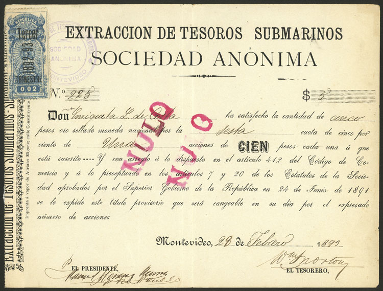 for the payment of part of 1 share of 100 Pesos of "Sociedad Anónima Extracción de Tesoros Submarinos", year 1893, with a nice revenue stamp, interesting! (Image)