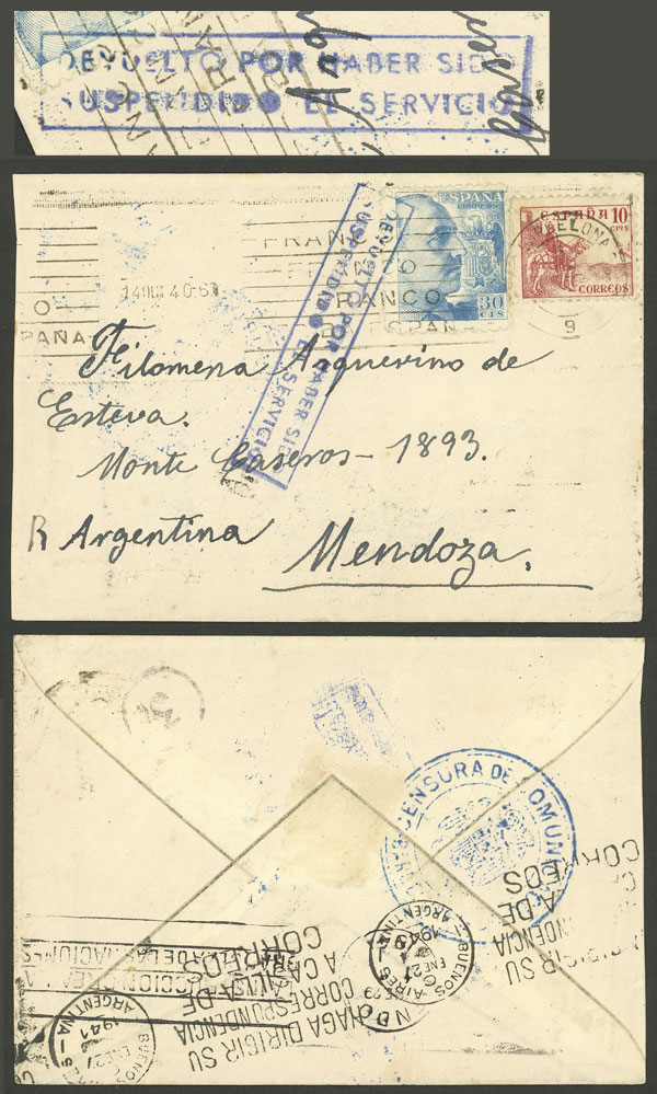14/OC/1940 Barcelona - Argentina, cover franked with 40c., with blue rectangular mark on front: "DEVUELTO POR HABER SIDO SUSPENDIDO EL SERVICIO", on back circular censor mark, and Buenos Aires arrival of 27/JA/1941, excellent quality,