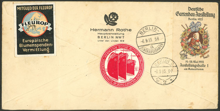 CATAPULTED FLIGHT: Spectacular cover with Nazi motifs, with attractive 24c. franking, 12 stamps cancelled "U.S. GER. SEA POST - S.S. BREMEN - 4/SE/1933", flown to Berlin via Southampton on 5/SE, with arrival backstamp of the following
