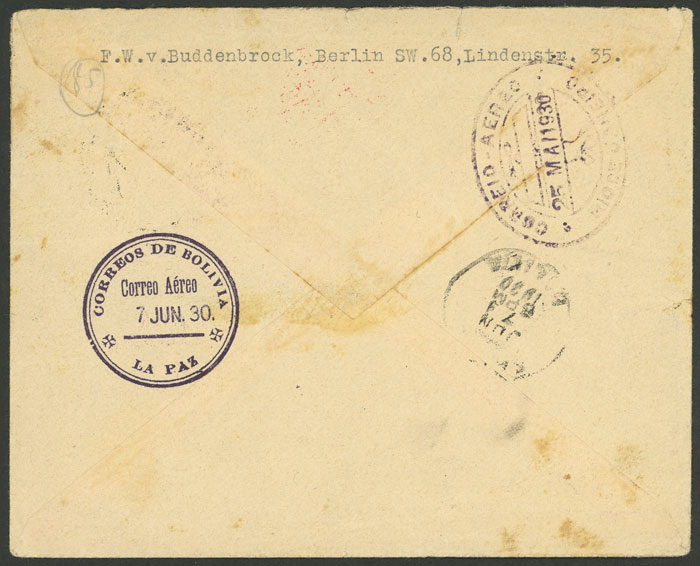 16/MAY/1930 Sevilla - Rio de Janeiro - Bolivia, cover flown by ZEPPELIN, with mixed postage (Spain + Brazil), it arrived in Brazil on 25/MAY/1930 and was carried to to La Paz by Syndicato Condor (arrival backstamp 7/JUN), rare! (Image) (Image-02)