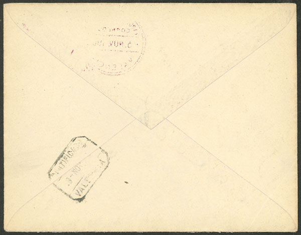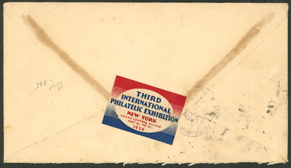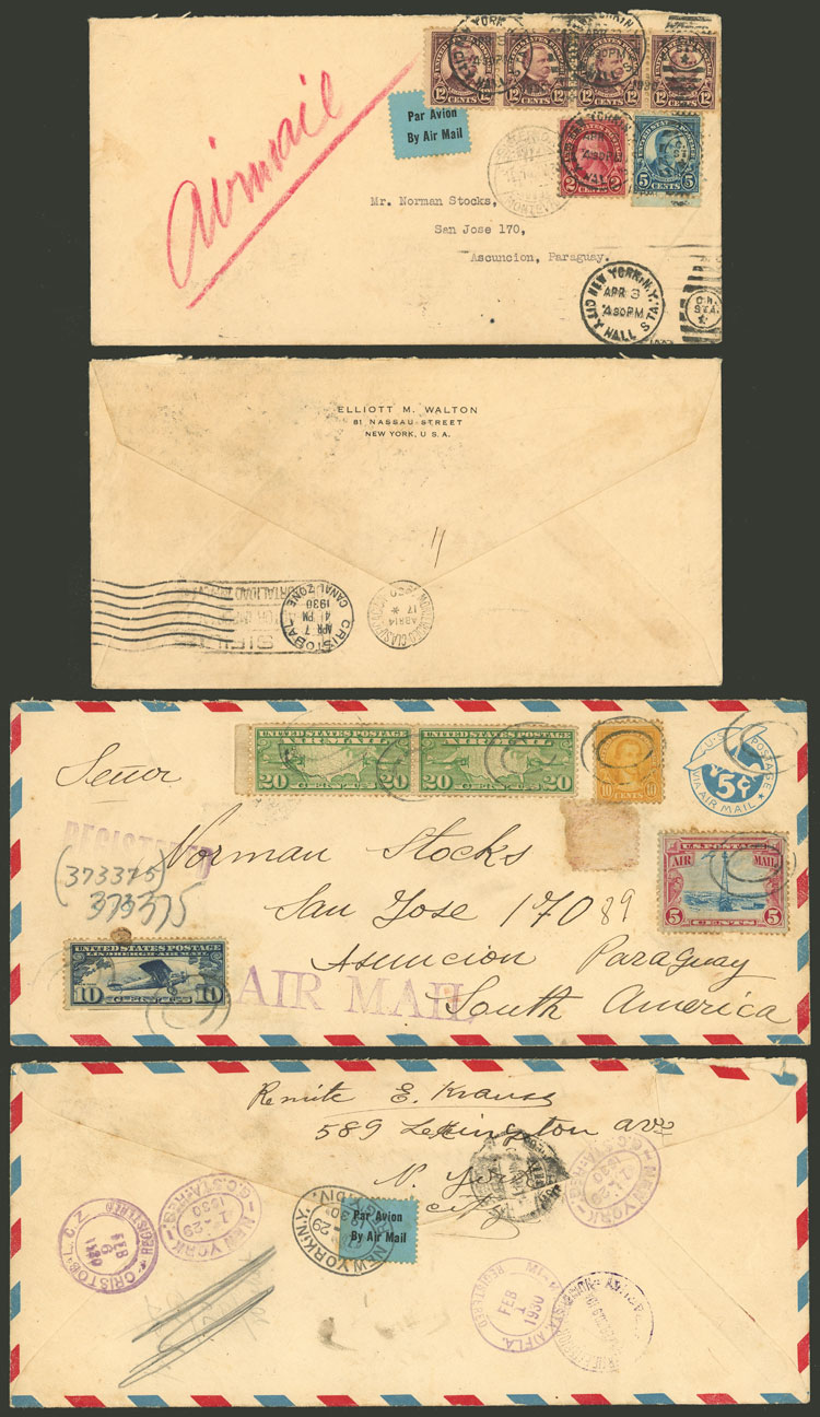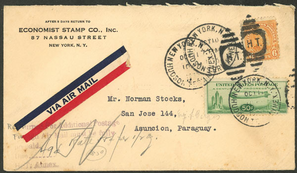 Airmail cover sent from New York to Paraguay on 10/OC/1935, originally franked with 6c. alone and returned to sender with the violet mark indicating the unpaid 49c. to complete the rate, on the following day the sender added a stamp of