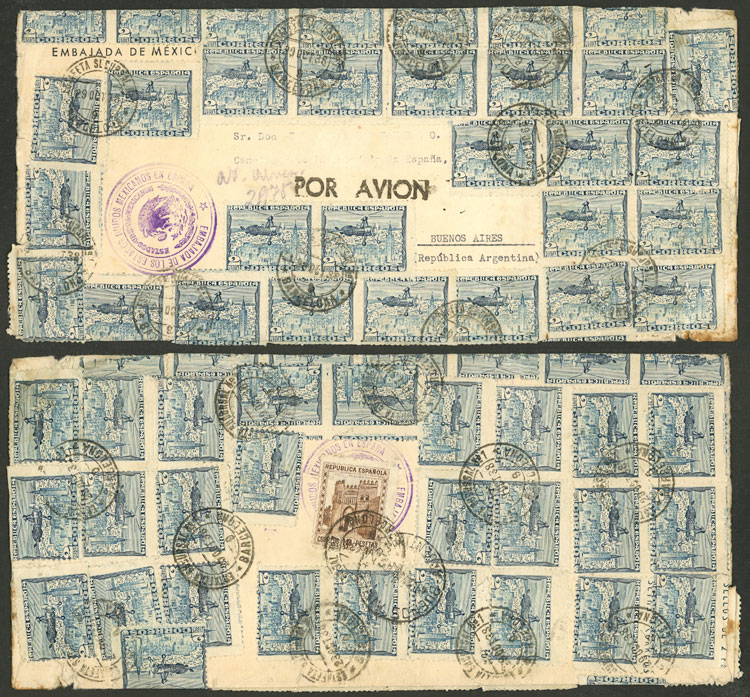 MULTIPLE?: Airmail cover sent to Argentina on 29/OC/1938 sent by "Embassy of the United Mexican States", with splendid franking of 126 Pesetas that includes 58 stamps of 2P. "helicopter" (Sc.C72B) + 10Ptas. "Puerta del Sol", with arrival mark of