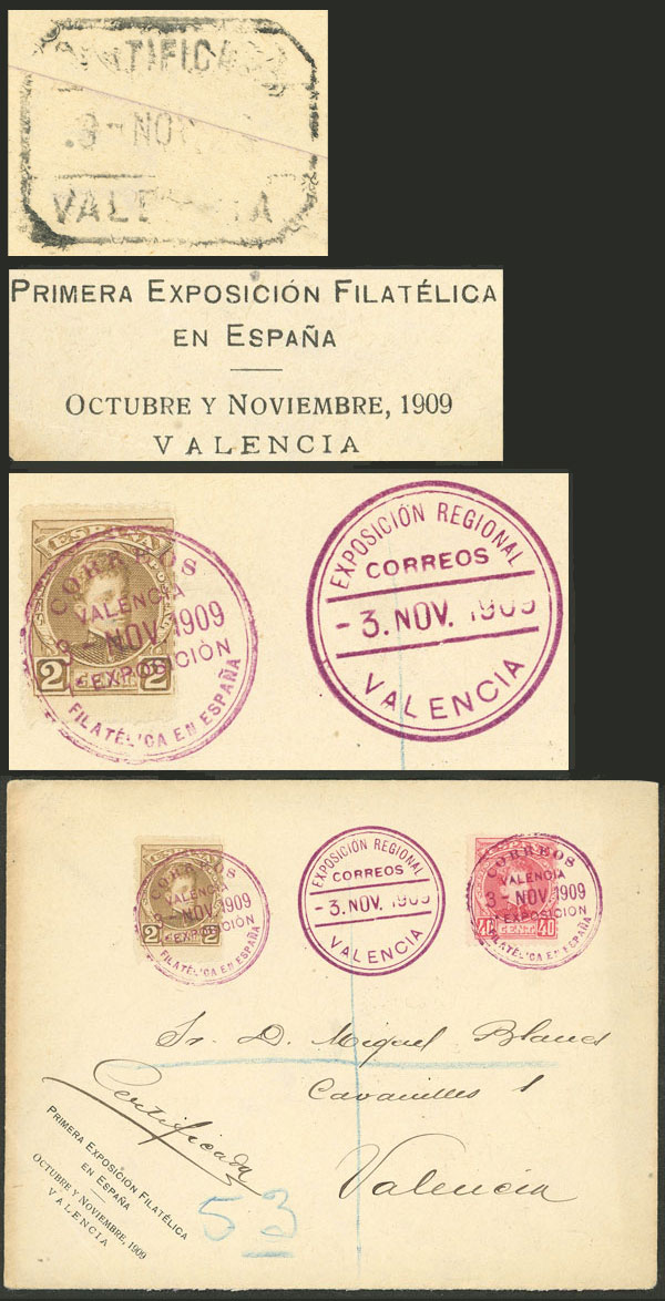 Registered cover used in Valencia on 3/NO/1909 franked with 42c., with postmarks commemorating the 1st Philatelic Exposition in Spain, excellent quality!