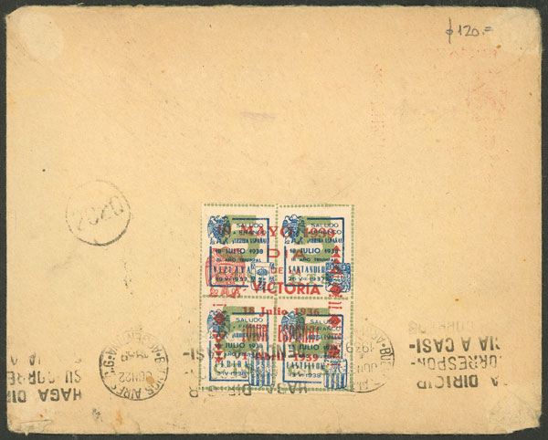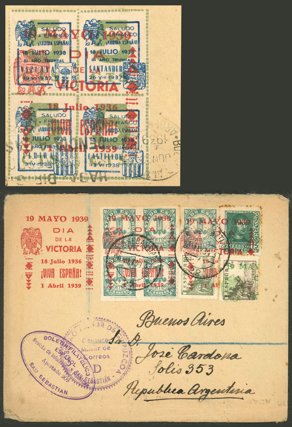 20/MAY/1939 San Sebastián to Argentina, cover franked on front and back with stamps overprinted "DIA DE LA VICTORIA", censor mark on front and Buenos Aires arrival on back, of 22/JUN, very interesting! (Image) (Image-02)