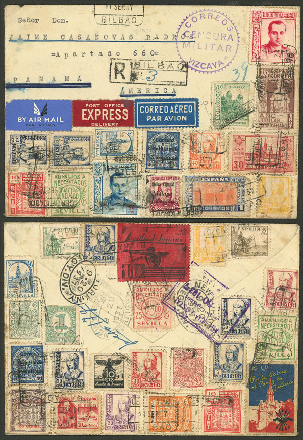 11/SE/1937 Bilbao to Panamá, registered and express airmail cover, with many stamps and varied labels on front and back, with censor mark, New York transit of 20/SE and Panamá arrival of 30/SE, very fine quality, fantastic! (Image)